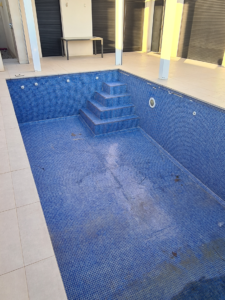 Swimming pool renovation, with new tiles, pump and pool filter.